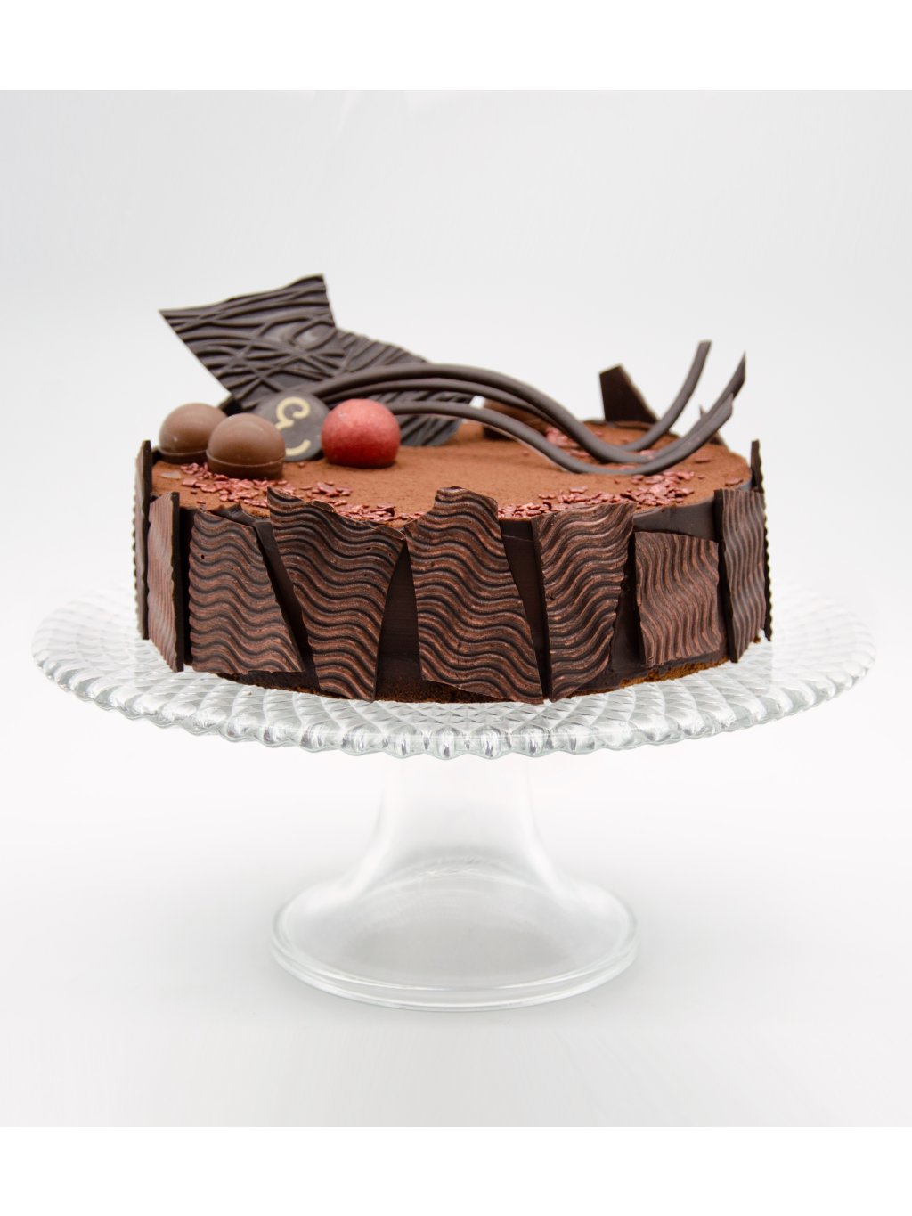 Dort s čokoládovou ganache, která je velmi sametové a jemné konzistence, zdobený kakaem a čokoládou