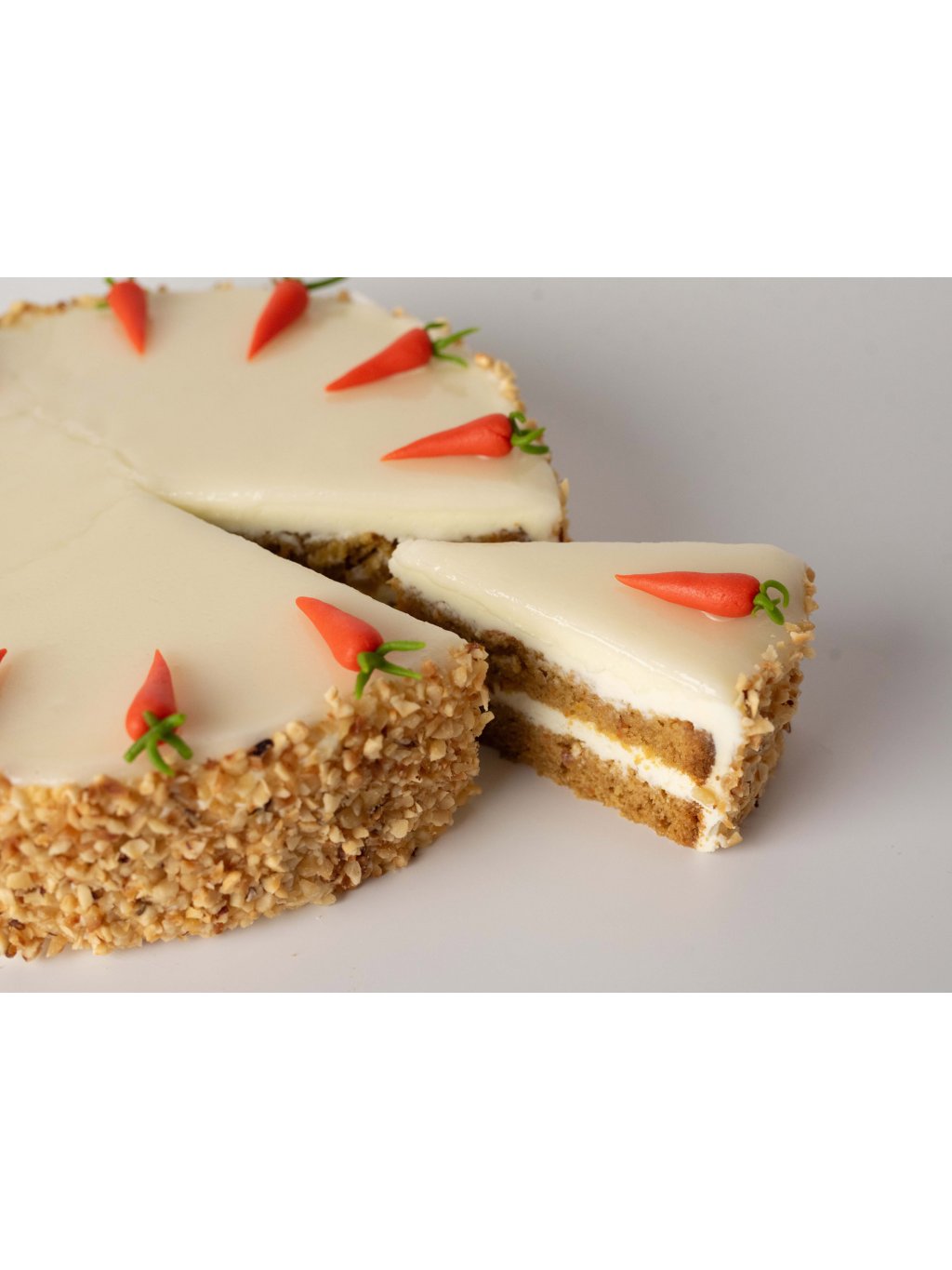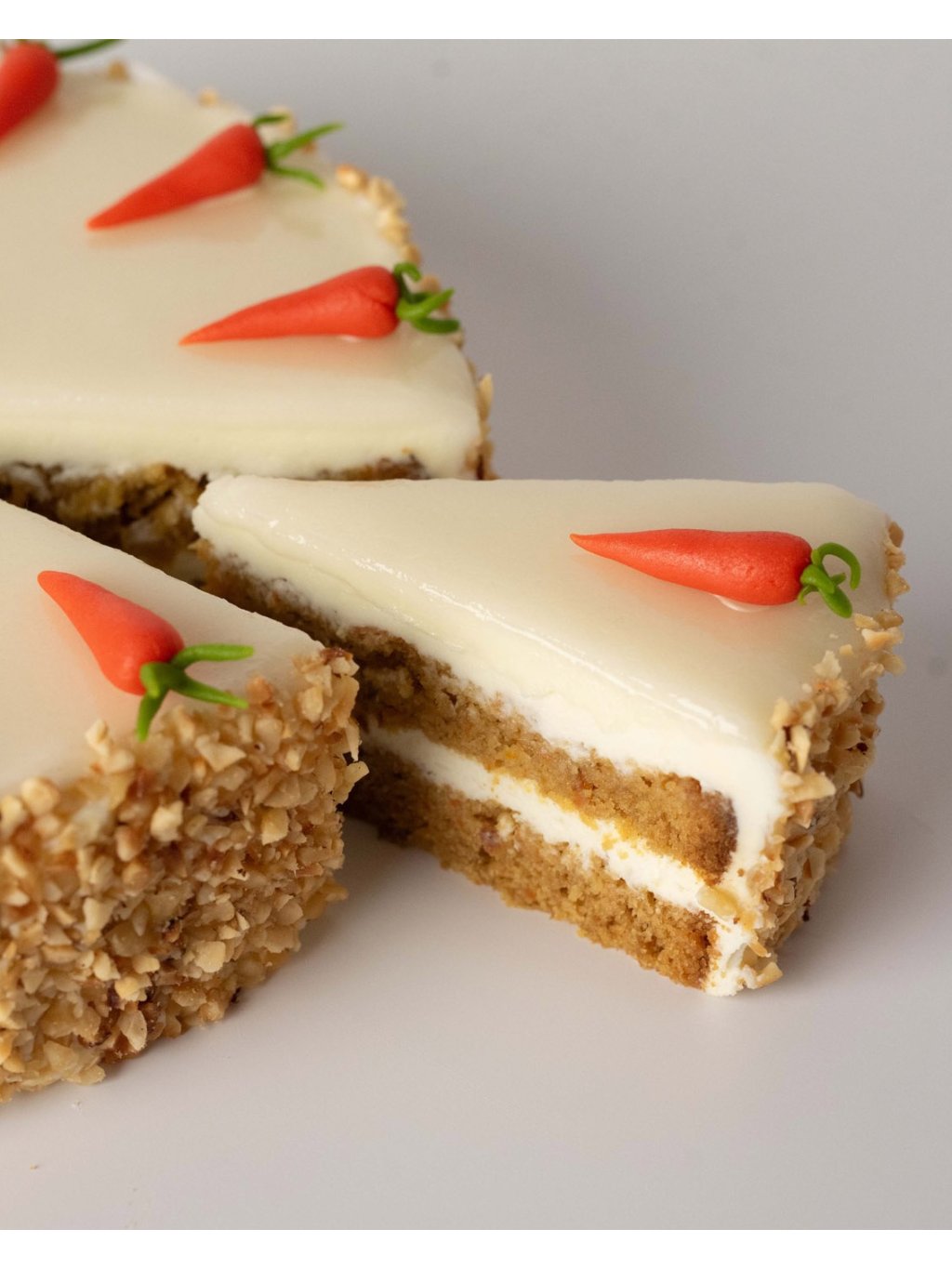 Mrkvový korpus s vyšlehaným tvarohovo-máslovým krémem a citronovou polevou, zdobený marcipánovou mrkvičkou